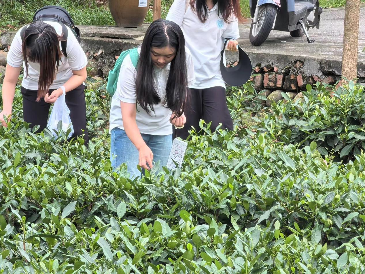上午,实践团队来到了明月村的一片茶园,现场学习和体验制茶程序中的“采茶”。在当地居民的指导下,团队成员很快的学会了“一叶一芯”的采摘方式,快速而有效的帮助他们完成采摘工作。在体验茶文化的过程中也受到了一次深刻的劳动教育,让我们领悟了劳动创造价值,激发了对劳动的热爱和尊重。