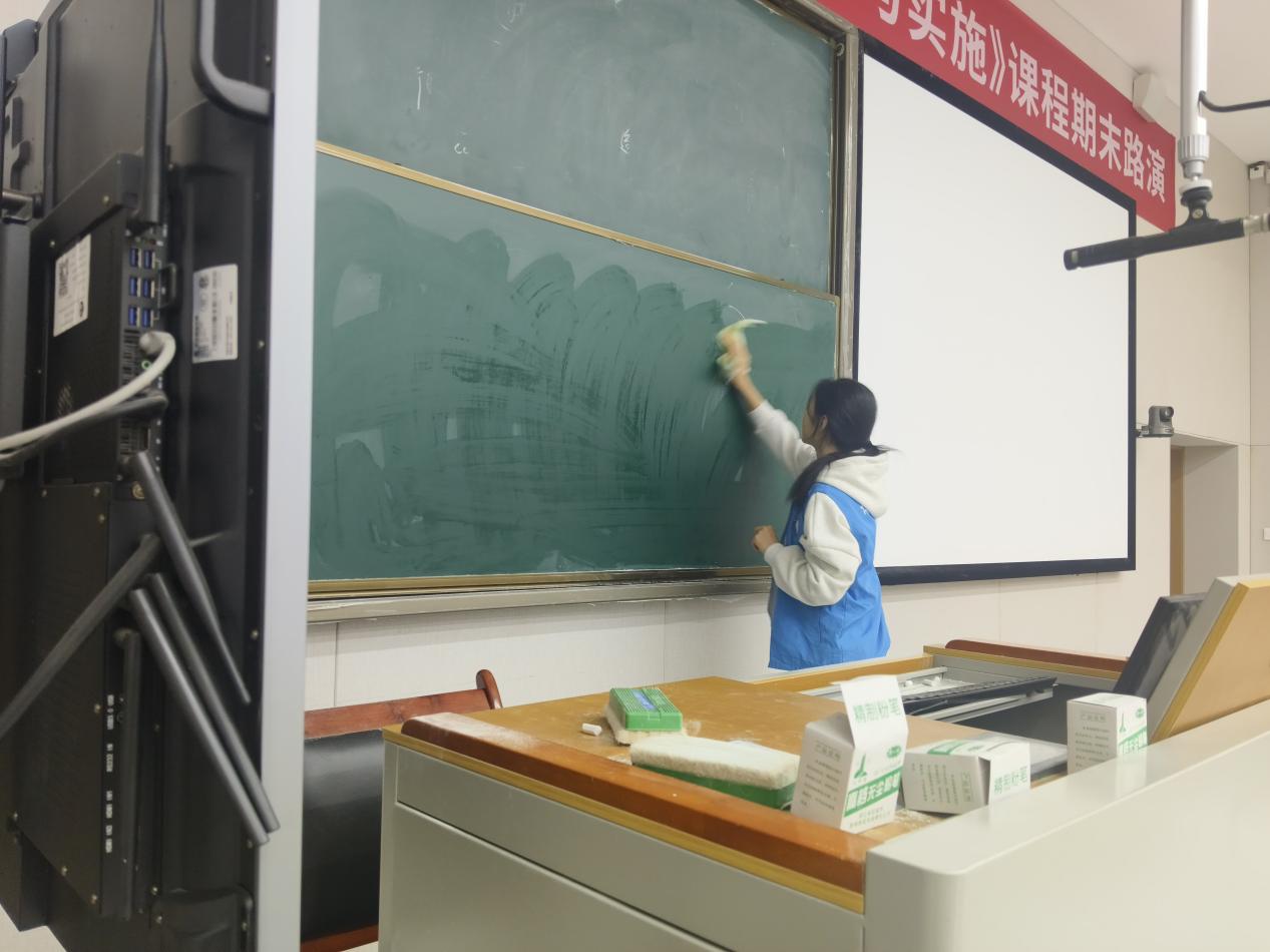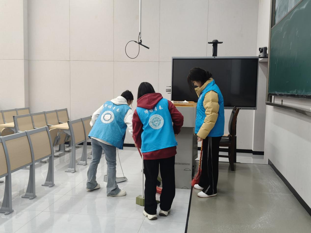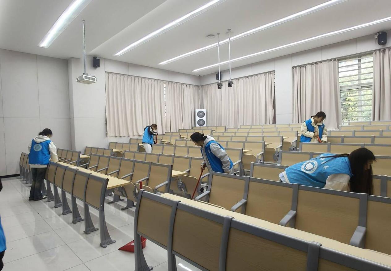 本次活动共招募志愿者30名。活动当天,志愿者们手持扫帚、拖把、 抹布等清洁工具,以小组为单位对B、C两栋教学楼个别教室展开“地毯式”清洁。同学们分工明确,仔细擦拭黑板槽的粉笔灰,俯身清理课桌夹缝的纸屑,细心摆放清洁角的清洁工具等。
