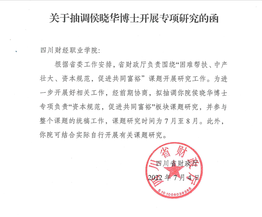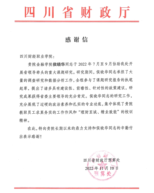 2022年11月10日,四川省财政厅向我院发来感谢信,对金融学院侯晓华同志提出感谢和表扬。