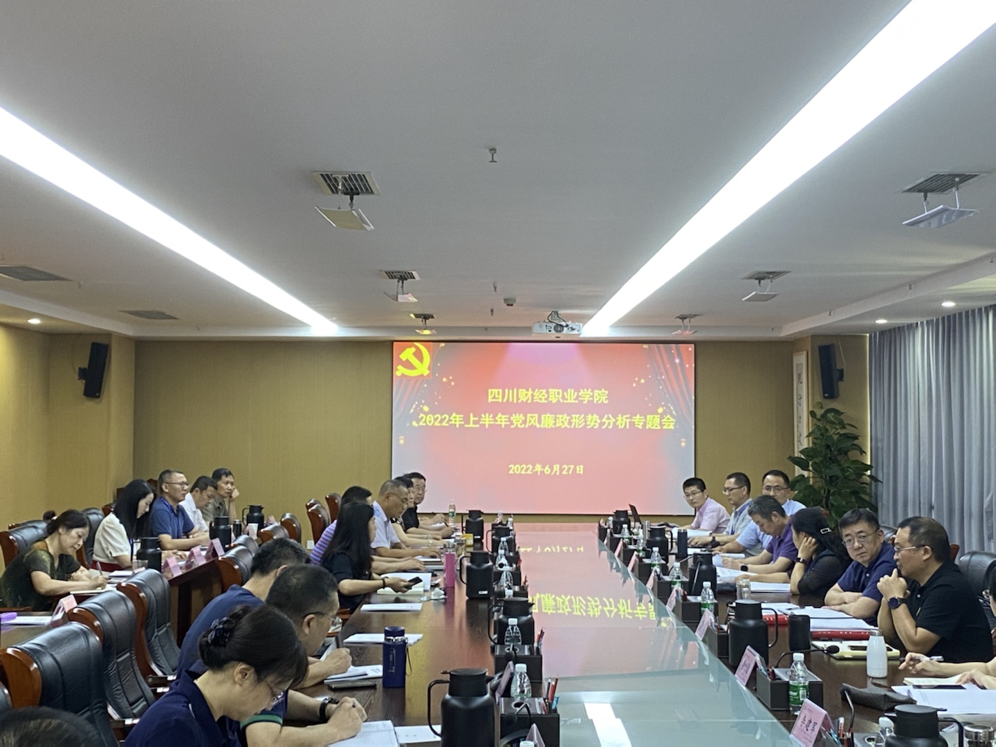 6月27日下午,我院在明德楼913会议室召开2022年上半年党风廉政形势分析会议。党委书记张华、党委副书记、纪委书记敬华,党委副书记、副院长易思飞,党委委员、副院长钟勇,党委委员、副院长罗潇,党委委员、副院长肖兆飞出席会议,各部门主要负责人参加会议。会议由敬华同志主持。