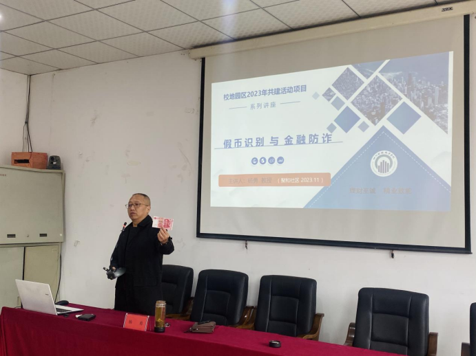杨勇做《假币识别与金融防诈》培训讲座,他利用纸币作为教学工具,有效地拉进了和居民朋友的距离,生动详实地讲解了“如何识别假币、不能违规使用假币、收到假币怎么办”等内容,结合当前时事,对如何做好金融防诈做培训。