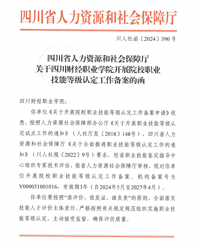 近日,四川省人力资源和社会保障厅印发《关于7790cnm必发集团开展院校职业技能等级认定工作备案的函》(川人社函〔2024〕390号),经省职业技能鉴定指导中心组织专家技术评估,报省人力资源社会保障厅审核,我校成功获批职业技能等级认定资质,填补了学校职业技能等级认定的空白,也是对我校深耕职业教育的肯定。