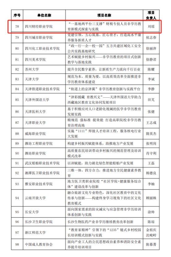 本次遴选,教育部最终确定了103个“非学历教育改革创新任务”项目,我院作为入选单位之一,既是对学院社会服务成果的肯定,更是不断提升社会服务能力的一份责任。学院将以此为契机,在做优做强财税领域培训服务的同时,拓宽现代信息技术服务、现代金融服务、新媒体技术、农村“三资”管理、社区大学等培训领域,服务地方经济高质量发展,为构建“人人皆学、处处能学、时时可学”的学习型社会贡献川财力量。