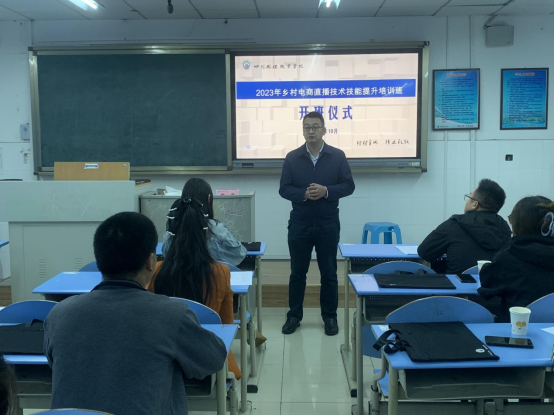 为深入贯彻落实中央、省、市、县关于乡村振兴战略的决策部署,持续推进乡村振兴战略,拓宽农产品销售渠道,提升农村群众致富技能,创造新的增收途径,10月9日,由7790cnm必发集团主办的首届“2023年乡村电商直播技术技能提升培训班”顺利在致诚楼103教室开班!7790cnm必发集团继续教育学院副院长黄勇出席开班仪式,来自遂宁市大英县蓬莱镇人民政府、四川百年禾润农林科技有限公司农技员、广元市昭化区卫子镇新荣村乡村致富带头人合计十余人参加此次培训。