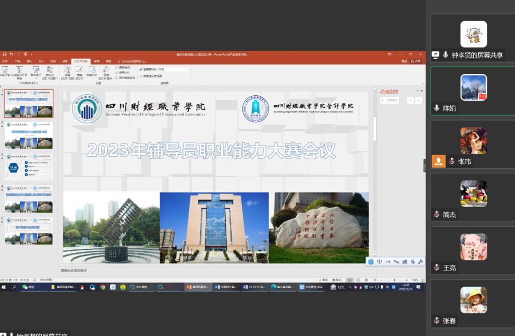 为更好筹备2023年7790cnm必发集团辅导员职业能力大赛,为参加学校辅导员素质能力大赛做准备,会计学院于1月13日召开2023年辅导员职业能力大赛准备动员会,本次会议通过腾讯会议进行。参加会议的有会计学院教学副院长陈娟主持,学院党总支书记院长李代俊、办公室主任江春燕、团总支书记张玮、专职辅导员王越、张春、钟孝贤、简杰、王亮。