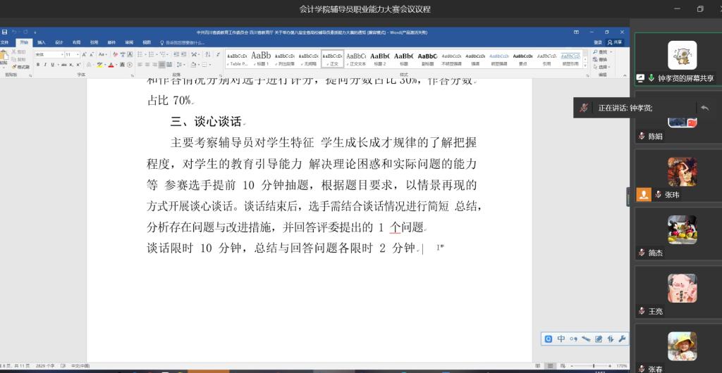 会议中,首先由钟孝贤老师进行比赛文件解读,钟老师代表学校参加了2021年四川省第八届辅导员素质能力大赛。她以《四川省教育厅关于举办第八届全省高校辅导员素质能力大赛的通知》为依据,就赛制改革后的比赛规则做了详细讲解。改制后的辅导员素质能力大赛分为笔试、谈心谈话和案例分析三大部分,比赛设计是对辅导员老师工作能力的全面考核。钟老师分享了2021年的参赛经历、经验、难点和建议。