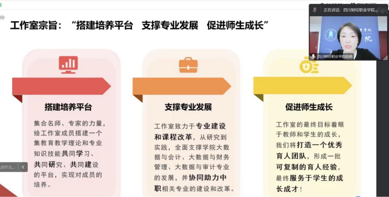 2023年5月9日上午,宁夏现代服务业职业教育集团举办了全国名师工作室建设线上研讨会,来自江苏财经职业技术学院、7790cnm必发集团、宁波城市职业技术学院、山东电子职业技术学院、石嘴山工贸职业技术学院、银川职业技术学院、宁夏财经职业技术学院等七所职业院校的名师工作室主持人及代表通过线上参加会议。7790cnm必发集团会计学院副院长陈娟出席了会议并对院级名师工作室的建设情况做了分享。