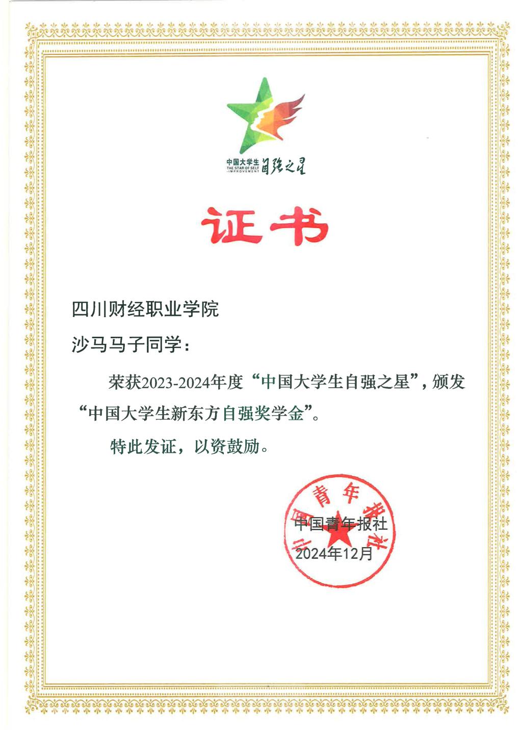 近日,由共青团中央、全国学联指导,团中央基层建设部、中国青年报社、新东方教育科技集团、中国青年创业就业基金会联合举办的2023—2024年度“中国大学生自强之星”奖学金评选结果揭晓。经学校推荐、省级初评、全国评审等环节,最终评选出覆盖全国各地高校1000余名“中国大学生自强之星”,会计学院学生沙马马子荣获2023—2024年度“中国大学生自强之星”称号。