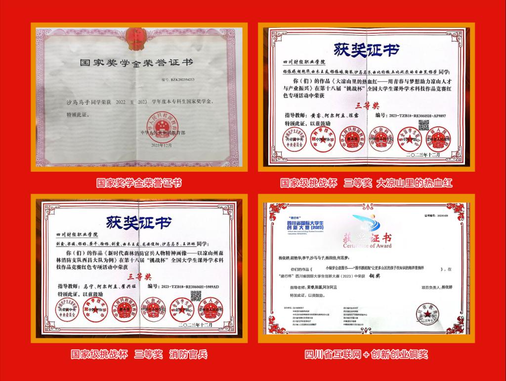 沙马马子,会计学院2021级大数据与会计专业11班学生,中共党员,四川凉山人。曾荣获国家奖学金、挑战杯红色专项省级一等奖2项和全国三等奖2项、四川省优秀大学毕业生、四川省大学生年度人物提名奖、一等奖学金4次、优秀共青团干部等荣誉称号30余次。