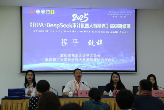 开班仪式上,重庆市商业会计学会会长、重庆理工大学云会计大数据智能研究所所长程平教授致辞,深入解析RPA与DeepSeek大模型技术融合对审计流程再造、风险识别及效率提升的重要意义,并鼓励学员成为审计领域智能化转型的中坚力量。