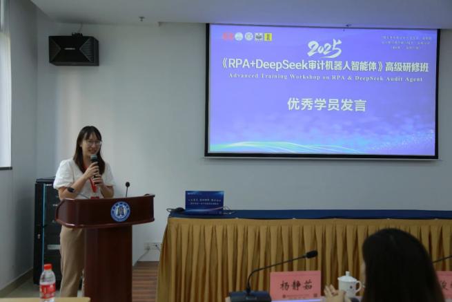 7月17日下午,研修班举行结业仪式,我院教师苏筱雪作为优秀学员发言。学员们从程平教授及主办方代表手中接过结业证书,为期四天的研修圆满落幕。我院教师表示,此次培训为审计智能化教学与实践提供了新思路,将把所学应用于后续教学、科研、课程建设等工作中。