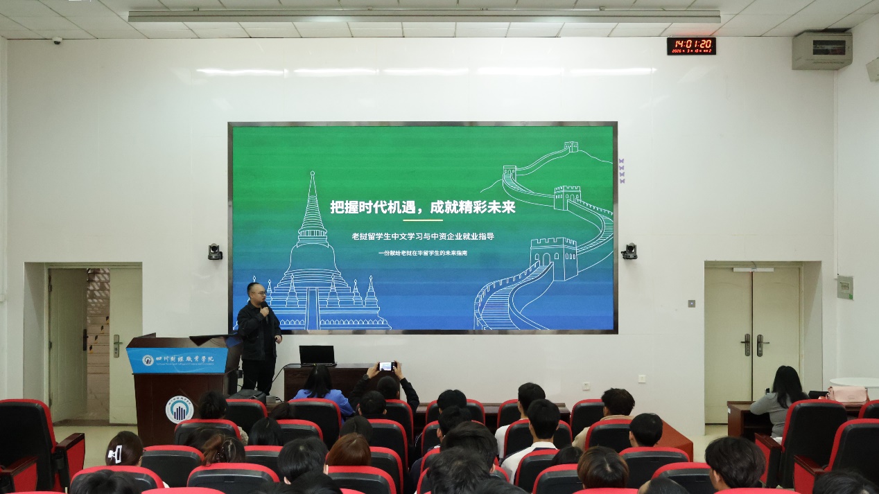 本次分享会特别邀请校友白玉东担任主讲人。他结合自身从校园迈向职场的成长历程,从语言之桥、机遇之地、能力之基、成功之本4个方面为老挝留学生们带来了一场极具深度的分享。白玉东强调,对于留学生来说,中文是当下求职市场中极具价值的“硬通货”。留学生不仅要掌握中文用于交流,更要成为中华文化与老挝文化交流互鉴的“架桥人”。