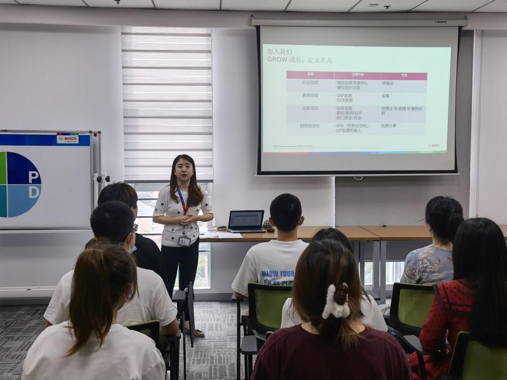 在沟通交流座谈会中,Maggie老师特别讲解了大家在入职前的相关问题,讲解了博世财务工作的行业信息、系统技能、业务培训、财务自动化的基本内容,入职后每位成员将会采取一对一的方式进行培训。此外,为了加强企业的凝聚性,实习生在职期间会进行跨流程分享,定期组织工作交流会,做到优中补缺,齐力奋进。