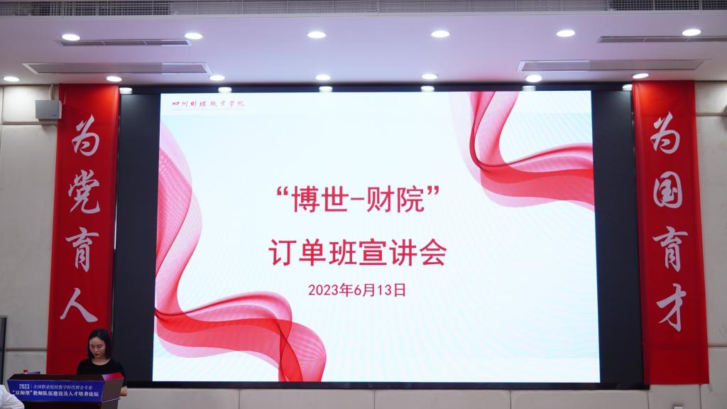 为深入学习贯彻党的二十大精神,全力拓宽2024届毕业生就业实习渠道,打开校企合作协同育人新篇章,2023年6月13日下午,博世(成都)信息技术服务有限公司业务主管谭小梅、明雪莲带领博世公司人力资源部各位同事一行莅临我校,于至诚楼B213教室开展“博世-财院”订单班专场宣讲会。我校会计学院院长、党总支书记李代俊,会计专业教研室主任岳秀敏、会计(中澳)教研室主任陈柯蒙以及80余名师生代表参加了本次宣讲会。会议由陈柯蒙主持。