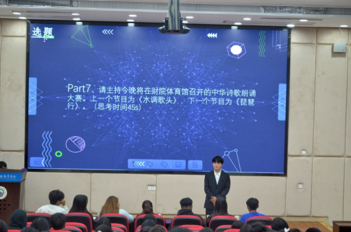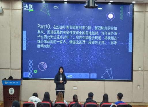 在个人项目中,参与比赛的参赛选手采用模拟主持和现场提问相结合的方式,随机抽取题目进行即兴主持,主要考验选手们的随机应变能力。参赛选手们沉着应对,在展示过程中吐词清楚、语言流畅,体现了选手们扎实的语言功底以及个人魅力。面对评委的各种犀利提问,选手们对答如流,赢得了现场观众们的热烈掌声。