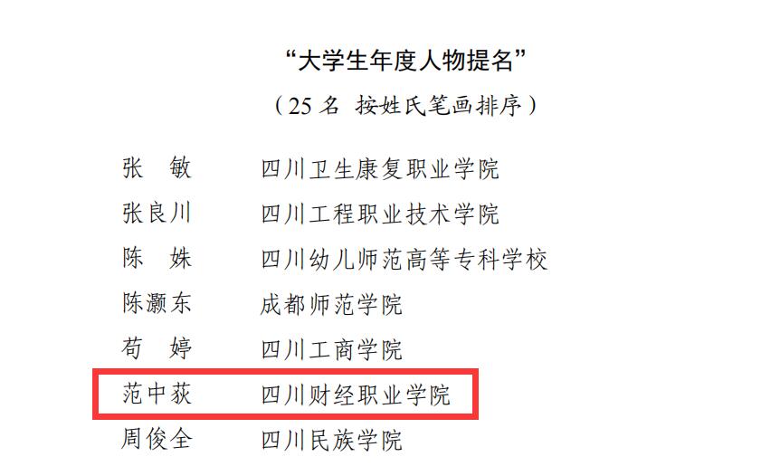 2022年11月9日,四川省委教育工委开展我省2022年“大学生年度人物”推选,经组织推荐、专家评审、结果公示等环节,共遴选出“大学生年度人物”20人,“大学生年度人物提名”25人。我院2021级大数据与会计专业14班范中荻同学获评四川省第十七届“大学生年度人物提名”奖荣誉称号。