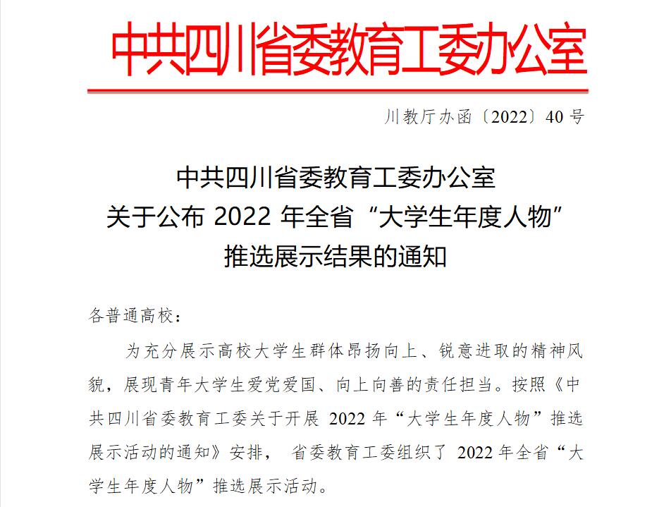 据悉,2022 年“大学生年度人物”推选活动是根据《人民网 大学生杂志社 光明日报社教育部 中国大学生在线关于组织开展第十七届“大学生年度人物”推选展示活动的函》要求,由中共四川省委教育工委组织开展。为喜迎党的二十大胜利召开,此次“大学生年度人物”候选人遴选推荐工作不仅展示我省高校大学生群体昂扬向上的精神风貌,激励广大青年学生立大志、明大德、成大才、担大任,争做堪当民族复兴重任的时代新人,同时在实现中华民族伟大复兴的时代洪流中踔厉奋发、勇毅前进,为两个百年的奋斗目标的实现添砖加瓦。