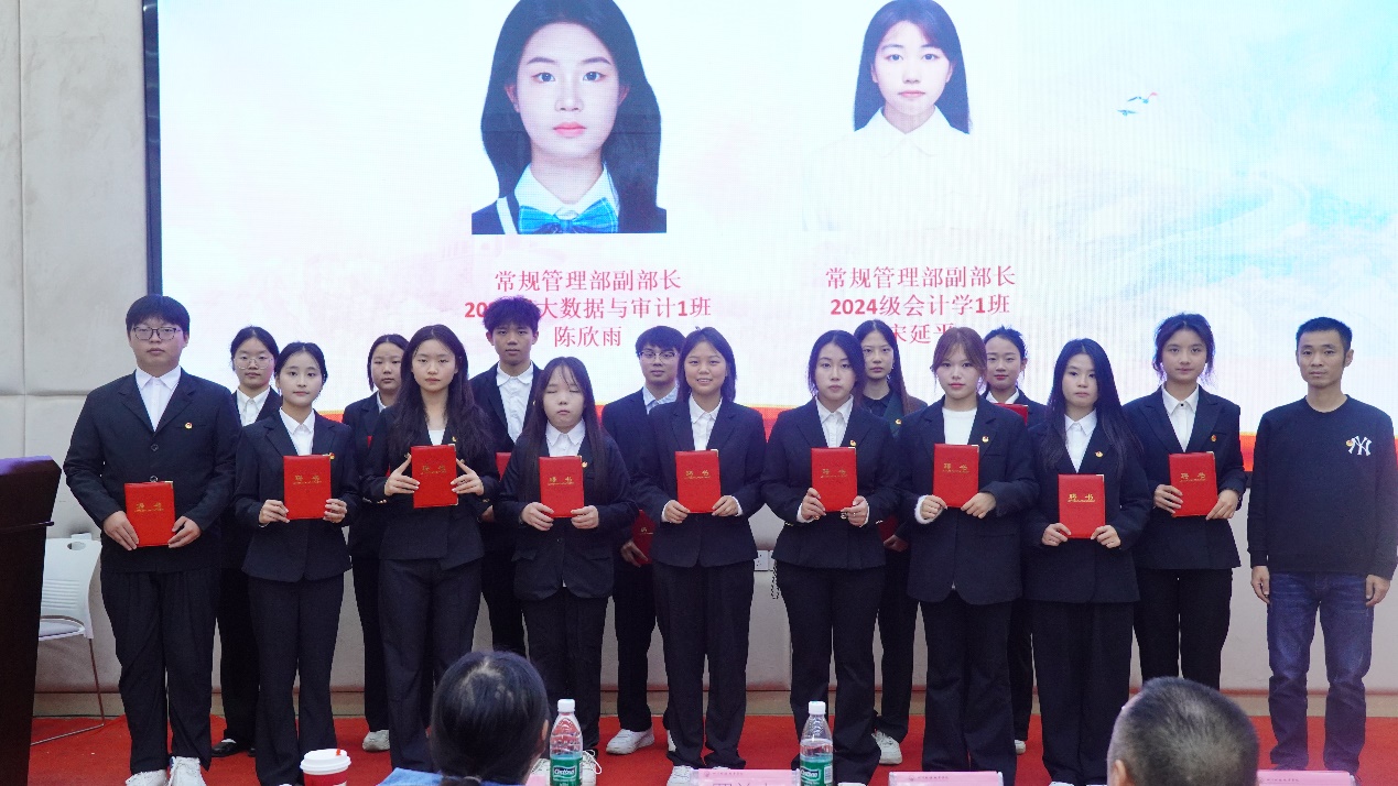 新当选的学生干部代表发言,表达了新一届干部对未来工作的信心与决心。随后,全体新干部在代表的领誓下进行宣誓就职,他们庄严承诺,将不负重托,全力以赴为会计学院的发展贡献自己的力量。