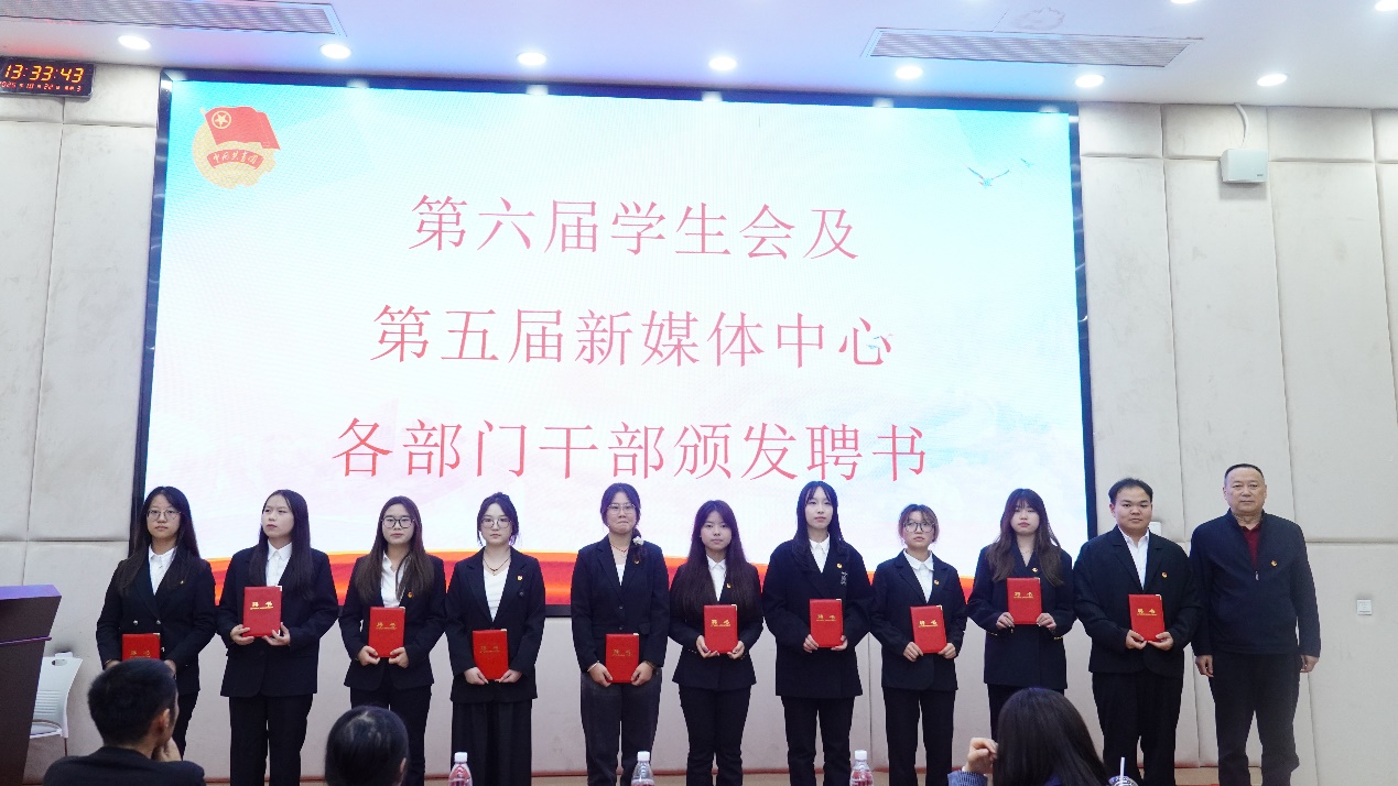 随后,会议对会计学院第六届团总支学生会新媒体中心拟当选干部任职进行投票表决,产生了新一届干部名单。杨晓荣书记分别为第六届团总支干部、第五届新媒体中心干部颁发聘书;罗兰杰老师分别为第五届学生干部代表颁发荣誉证书、为第六届学生会干部颁发聘书,并合影留念。