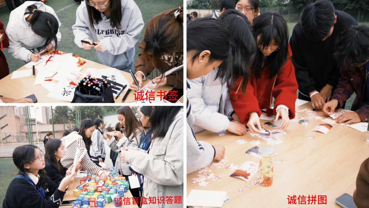 这场以“诚信”为主题的游园会活动在校园内热闹启幕,同学们通过趣味互动的方式,沉浸式感受诚信的内涵与价值。活动现场设置了诚信书签创作、诚信拼图、盲盒知识答题三大特色环节:在书签创作中,同学们拿起画笔,将“言必诚信,行必忠正”等诚信格言与创意插画结合,亲手制作的书签既是实用的工具,也是诚信理念的“随身提醒”;拼图区域里,大家分工协作拼接印有诚信主题图案的碎片,在动手过程中体会“以信聚力”的意义;盲盒答题区前更是排起长队,拆开盲盒抽取诚信知识题目,以轻松的形式让诚信知识“入脑入心”。