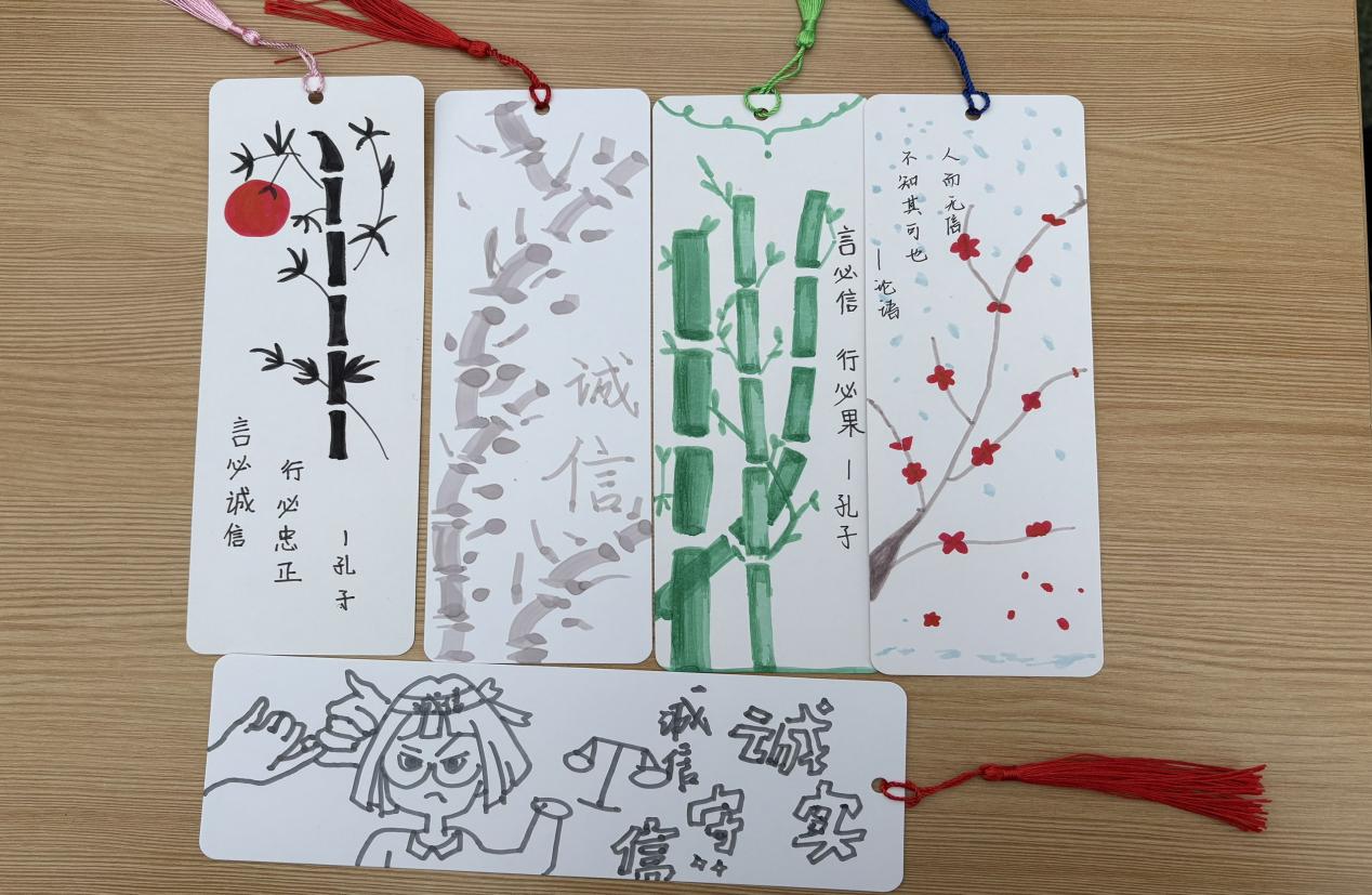 经典格言落于纸上,搭配梅花、竹枝等国风插画,或是可爱的卡通形象,让严肃的诚信主题变得鲜活灵动。自己创作的诚信书签夹在书本里,每次翻开都能想起今天的体验。