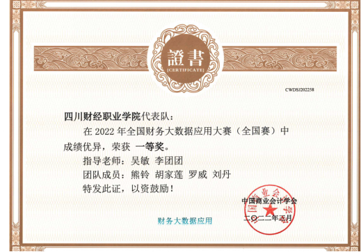 2022年3月26日,全国财务大数据应用大赛落下帷幕。由来自会计学院会计专业的4名同学——熊铃、胡家莲、罗威、刘丹组成的参赛队,在学院领导的全力支持和吴敏、李团团两位指导老师的精心指导下,经过紧张激烈的角逐,以大数据实践操作第一名的成绩获得了“全国财务大数据应用大赛一等奖”。