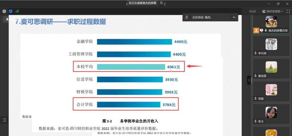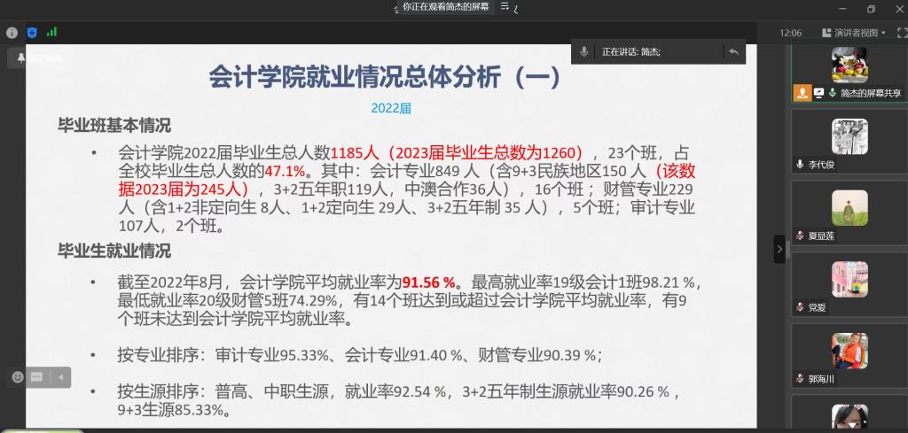 首先,简杰通报了会计学院2022年就业和双创工作成绩,对会计学院整体和各个专业就业情况进行了数据分析,从全国就业创业面临的新形势入手,结合2022届毕业生就业质量报告数据首先对2022年我校毕业生就业创业特点进行深入分析。