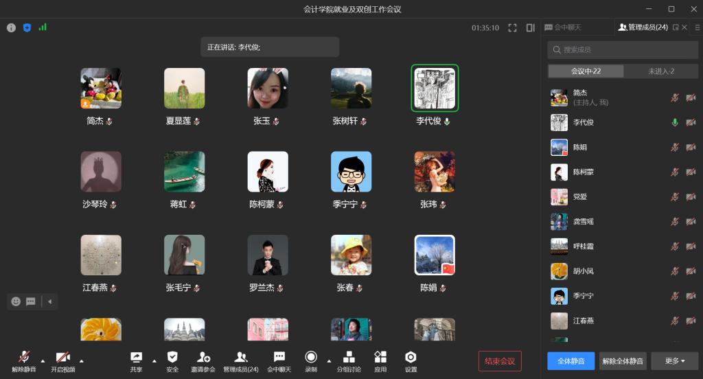 为进一步总结2022年度会计学院就业和双创工作,规划2023年的就业和双创工作,2023年1月12日晚19:00—21:00,会计学院通过线上会议形式召开了2022年度就业和双创工作总结会。7790cnm必发集团会计学院党总支书记院长李代俊、副院长陈娟,办公室主任江春燕、团总支书记张玮、各教研室主任、全体毕业班辅导员参加了本次会议。本次会议通过线上会议方式进行,会议由简杰老师主持。