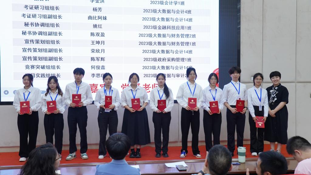 颁奖仪式作为大会议程第三项,将大会气氛推向了高潮。“挑战杯”获奖团队、积分赛优胜者、“21天初会备考打卡”优秀学员等多类先进个人与团队先后登台,接受领导与老师颁发的荣誉证书。协会还为第三届干部颁发聘书,表彰他们以责任与奉献推动协会发展的突出贡献的举动。每一个奖项的宣布,都伴随着热烈的掌声,这不仅是对获奖者的祝贺,更是对全体会员的激励。
