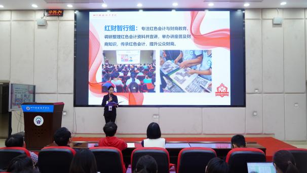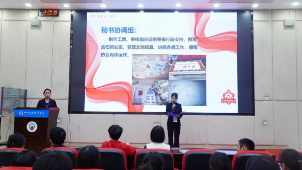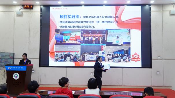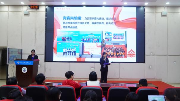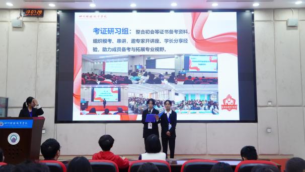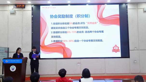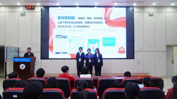 随后协会会长代雅洪上台,全面介绍协会特色与优势:协会以“立诚为本、弘毅为志”为宗旨,专注培养高素质会计人才,以专属文创传递会计人诚信与坚毅品格,会员赛事成果丰硕;还通过“走进博物馆”等研学拓展视野,设积分奖励制促进参与,各组负责人也亮相解读职能,展现协会专业多元体系。