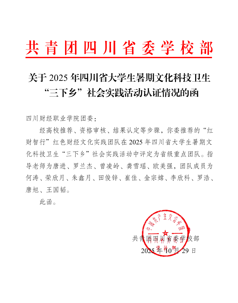 日前,经学校推荐、资格审核、结果认定等步骤,会计教研室党支部组织委员唐进指导的“红财智行”红色财经文化实践团队在2025年四川省大学生暑期文化科技卫生“三下乡”社会实践活动中被评定为省级重点团队。
