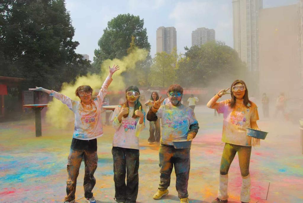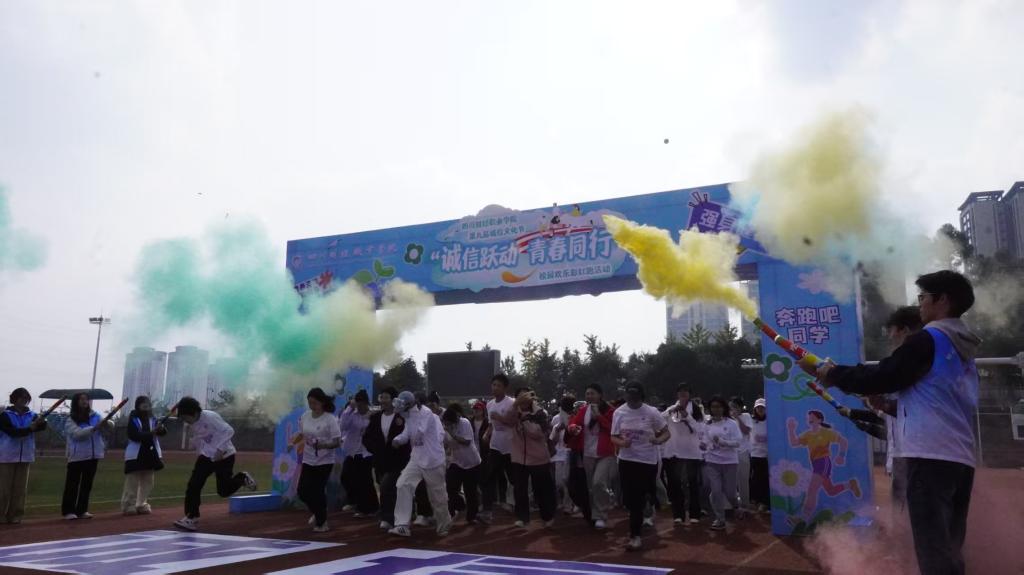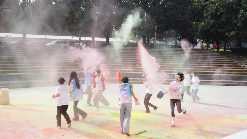 沿途设置的欢乐休息小站提供彩粉,同学们相互喷洒互动,现场气氛热烈非凡。参赛者有的携手同行、相互鼓励,有的奋勇争先、活力四射,志愿者全程引导,保障活动有序进行。