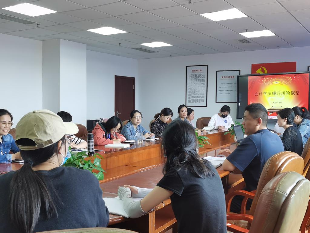 2022年5月19日下午3:30,会计学院2022年党风廉政建设廉政风险防控专题会议在613会议室召开,会议由学院副院长(总支纪检委员)陈娟主持,学院党总支书记刘波、各支部委员、行政人员、教师代表、辅导员参加了此次会议。