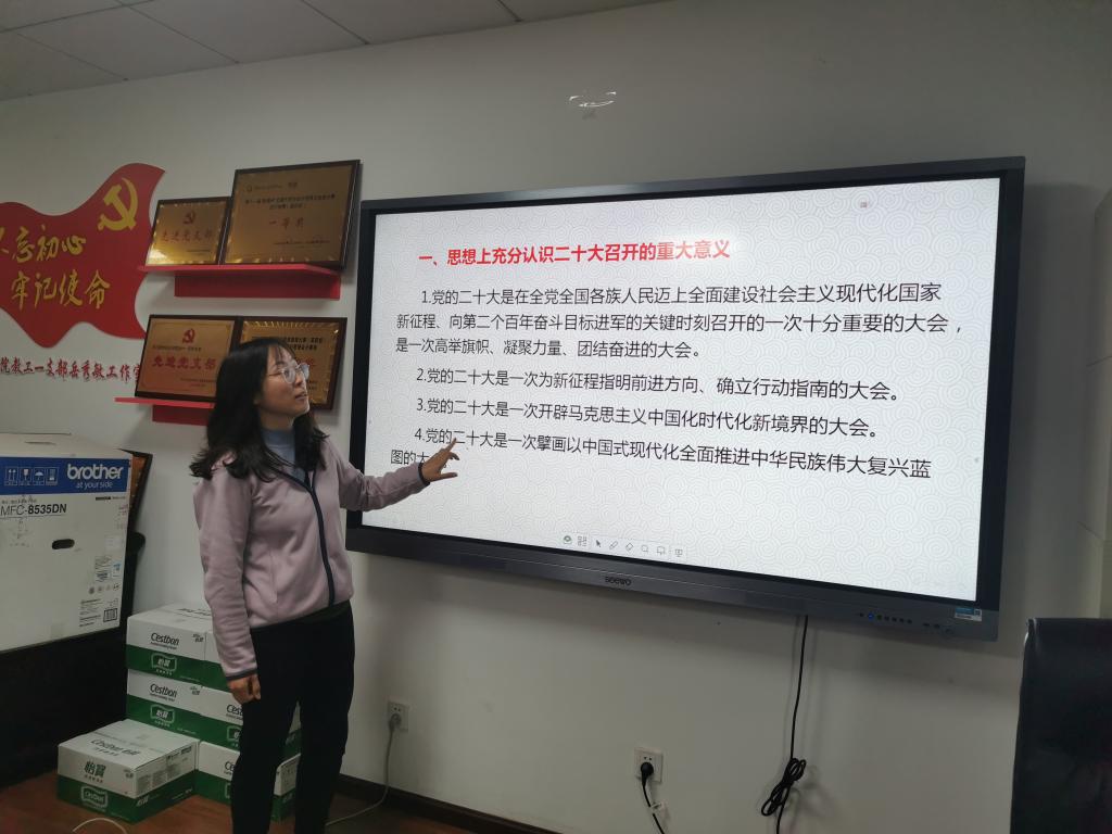 支部书记通过讲党课的方式,将二十大报告的主要精神传递给了支部的每一位党员。呼桂霞同志指出,每一位党员都应当将党的二十大报告作为必修课,思考一名教师党员,应当如何不忘为党育人、为国育才的初心,为中国式现代化建设提供人才保障,落实立德树人的根本任务。