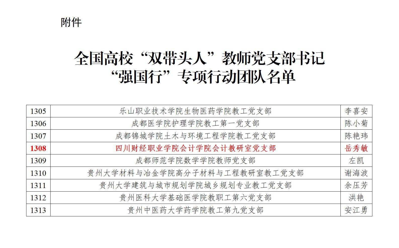 近日,教育部办公厅公布了全国高校“双带头人”教师党支部书记“强国行”专项行动团队名单,我校会计学院会计教研室党支部入选。