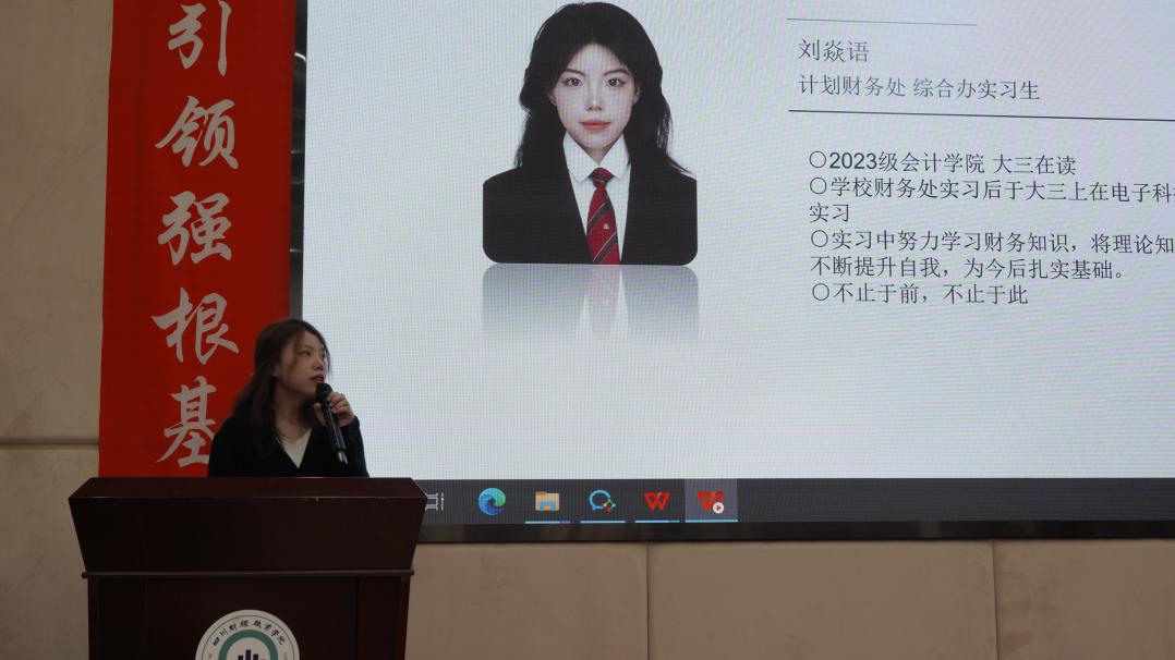在嘉宾分享环节,第一期优秀学员刘焱语学姐结合自身从校内实训到高校实习的成长经历,介绍了票据整理、报账处理等实际工作内容,分享了专业技能与综合能力的提升收获,并鼓励学弟学妹脚踏实地、积极投入,在实践中积累宝贵经验。