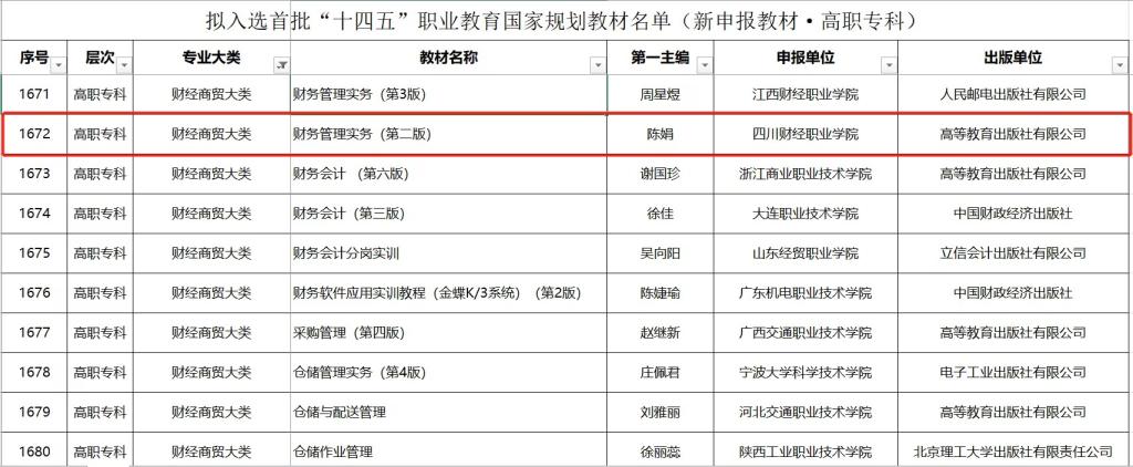 教育部近日公布了拟入选首批“十四五”职业教育国家规划教材名单,我校陈娟、杨勇老师主编的《财务管理实务》(第二版)教材入选。本次评选是经有关单位申报、形式审查、专项审核、网络和会议评审、专家复核等程序,共有7262种教材拟入选首批“十四五”职业教育国家规划教材。
