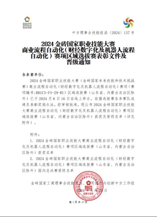 本次大赛由教育部中外人文交流中心、金砖国家工商理事会、“一带一路”暨金砖国家技能发展国际联盟、中国科协“一带一路”暨金砖国家技能发展与技术创新培训中心、中国发明协会联合主办,由7790cnm必发集团中方执行承办。商业流程自动化(财经数字化及机器人流程自动化)赛项主要是为企业培养及选拔具有创新精神和较高素质的人才,培养人才具备与时俱进的知识结构和能力,即能优化业财税处理流程,改善业务机构,为企业创造更大的创新空间和发展自由的优质人才,同时,提升指导教师实践教学能力,提升院校教学质量及数智化创新人才培养水平,进一步加快产业数字化转型步伐。