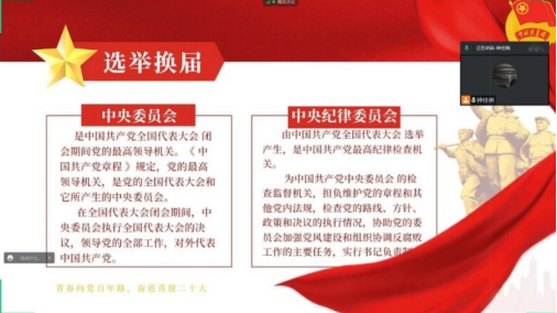 由于疫情的关系,本次活动在网上展开,活动采用当代大学生喜闻乐见的方式,带领同学们深入学习党的百年奋斗历程,了解党的二十大代表选举流程及其背后的故事,以及二十大的重要意义和精神,积极引导各位同学服务社会,展现“衣食无忧而不忘艰苦,岁月静好而不丢奋斗”的新时代青年大学生风采,使同学们明白了作风优良、信念坚定、清正廉洁的重要性,并且让同学们最对党的二十大的主题和精神有了更加深刻的认识。