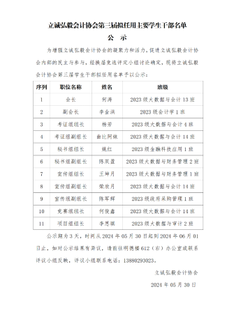 (立诚弘毅会计协会第三届拟任用主要学生干部名单)