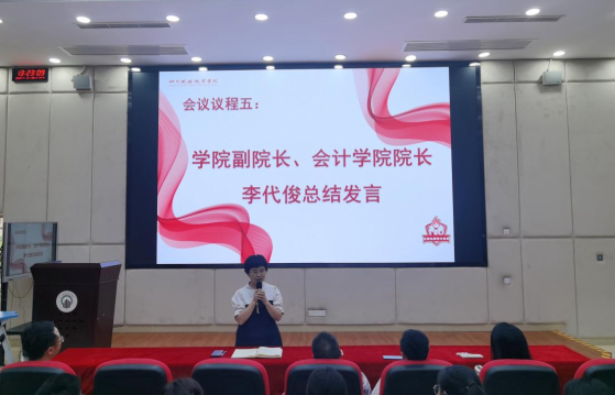 最后,学院副院长、会计学院院长李代俊讲话。李院长肯定了协会为开展并组织活动所做的计划安排。她要求新的一届应该加强对内对外的交流,积极沟通和学习,开展创新性活动。她强调协会需要紧跟新时代脚步,将AI智能化融入活动;以及要从多维度对协会进行宣传,做足做好宣传工作,并在以后的工作中优化组织结构。她希望协会明确未来发展目标、方向,深度融合学校理念,完善协会平台,为大家提供更多专业性活动。