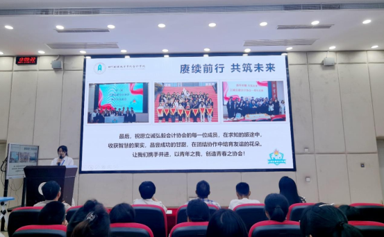 大会第二项,第二届协会副会长康嘉宁对本届协会工作进行汇报。副会长康嘉宁首先展示了本届协会所获荣誉及活动风采;其次,介绍了协会的组织结构、招新情况;接着,康嘉宁对各组工作的开展情况进行了全面总结;最后,她倡议全体会员“以青年之我,创造青春之协会”,愿立诚弘毅会计协会在一届又一届的传承中,展现风采和力量,书写更加壮丽的篇章。