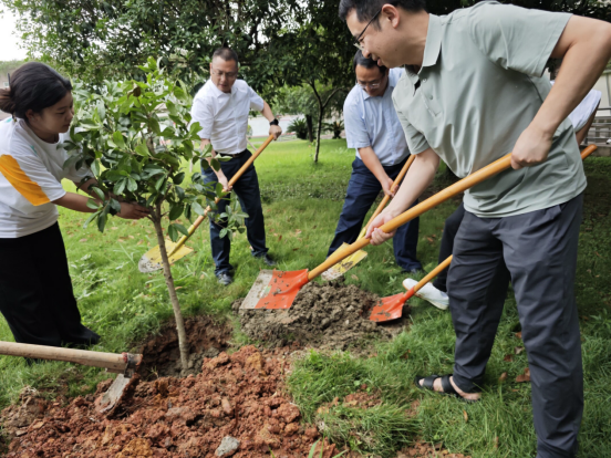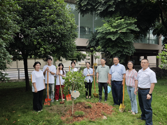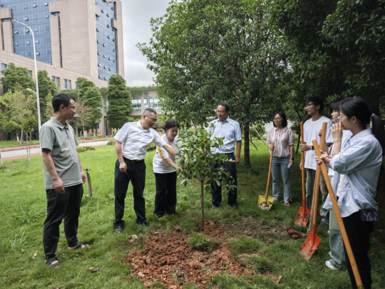 下午1点整,四川财院职业学院党委委员 副院长肖兆飞、党委委员 会计学院党总支书记郑代富、会计学院副院长曾海帆、会计学院副院长胡小凤、辅导员曾露与2022会计本科班的四位学生代表在教学楼c栋前共同种下22级会计本科班赠予川财院的丹桂树,手植丹桂,情满财院。