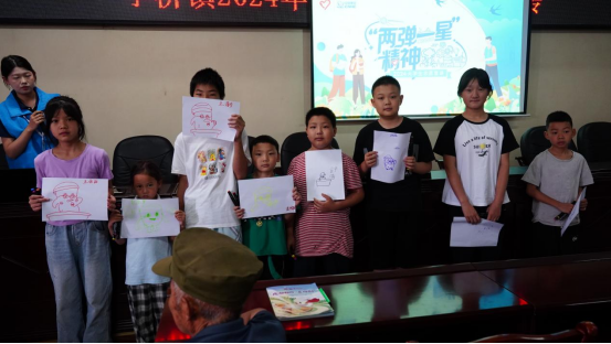 实践团队老师胡秀梅带领小朋友们回顾了“两弹一星”的知识,通过生动形象的生活中常见的导航系统等比喻让小朋友们记住了何为两弹、何为一星。最后胡秀梅老师还鼓励小朋友们好好学习、天天向上,为中华之崛起而读书。现场的小朋友们认真倾听、积极参与互动,纷纷表示要向科研工作者们学习,立志报效祖国。