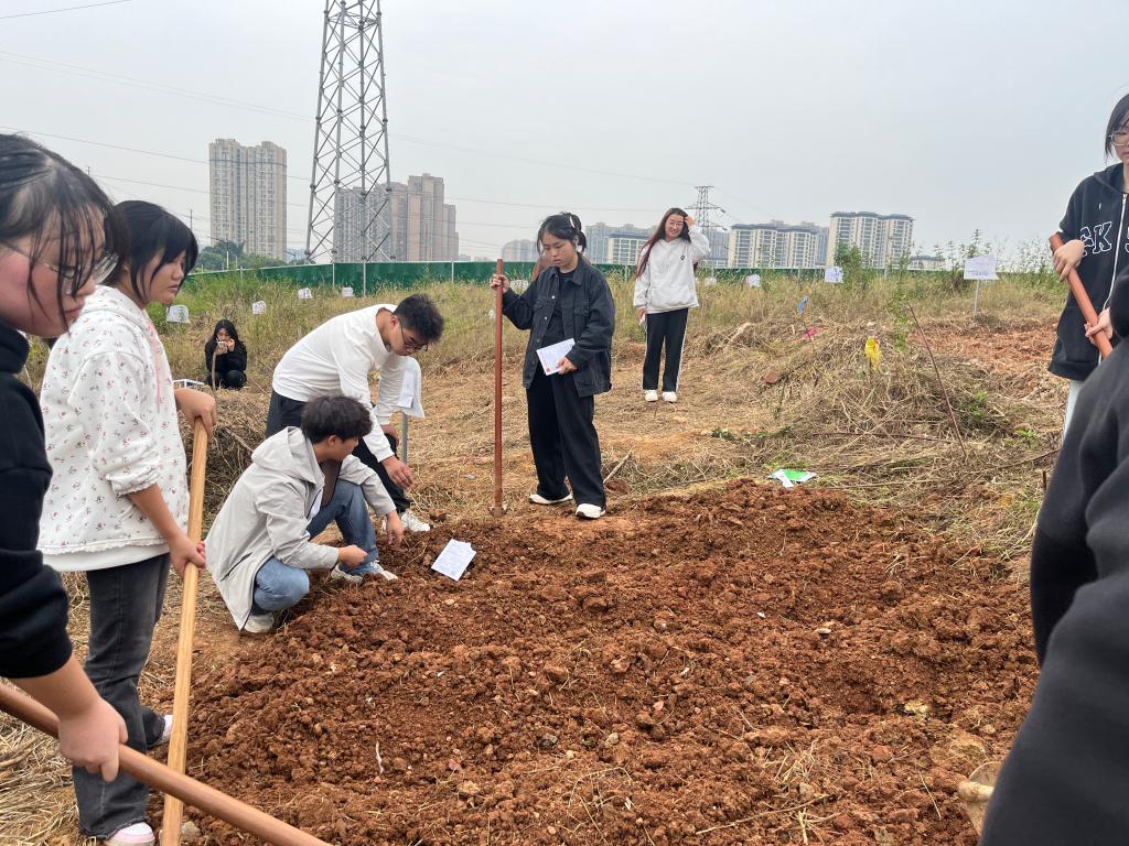 在播种环节,同学分工明确,各司其职。松土、起垄、播种、浇水,在场每位同学都有序投入到劳动实践中,忙得不亦乐乎。