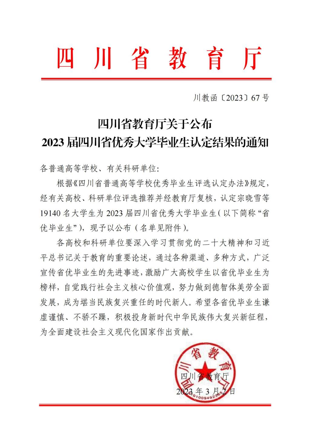 近日,四川省教育厅公布了2023届四川省优秀大学毕业生认定结果的名单,全省19140名大学生被评为“2023届四川省优秀大学毕业生”。我院范中荻等41名大三学子被评为四川省普通高等学校2023届优秀毕业生。
