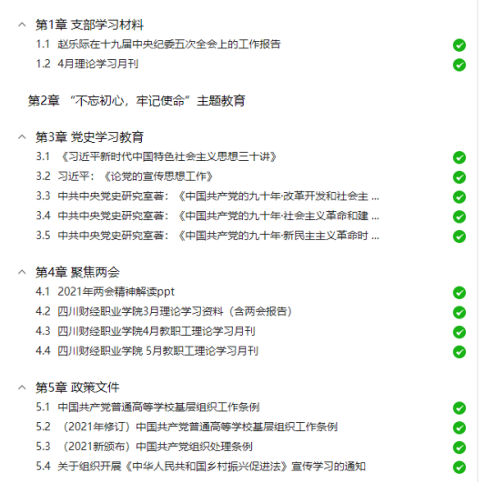 4.2021年4月,教工第一党支部全体党员自觉学习国家、四川和成都市十四五规划,并组织老师们积极参与学院双高计划申报。学习形式为“学习通”。学习内容如下: