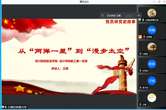 党员王薇老师分享了党史故事——从“两弹一星”到“漫步太空”。建党100年,我们的祖国发生了翻天覆地的变化,其中也包括航天事业。两弹一星在艰难的条件下能够短时间研制成功,靠的就是他们身上的精神,热爱祖国,无私奉献,团结协助,勇于攀登,严谨细致,一丝不苟,这些都是我们要学习地方。我们如今生活在这样一个安定团结、文明幸福的国家,就是因为有着中国共产党的领导,因为有无数革命先辈的牺牲付出,有可爱可敬的英雄替我们负重前行,我们的生活来之不易,要加倍珍惜!