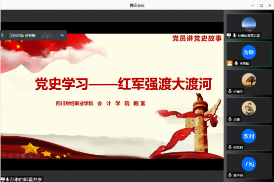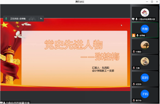 为树立正确党史观,推动党史学习教育深入人心。2021年11月23日,会计学院教工第一支部开展了第二轮“人人讲党史”支部活动。会议由会计学院教工第一支部书记岳秀敏主持,会计学院教工第一支部全体党员教师参加。
