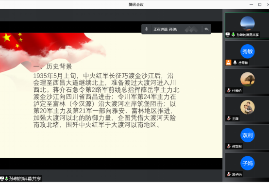 党员孙琳老师分享了党史故事——红军强渡大渡河。坚信中国革命能够成功的坚定信念,使作战部队全军上下对这次作战充满了必胜的信心。勇士们正是凭着对中国革命的无限忠诚,发扬大无畏的革命英雄主义精神,不怕困难,不怕牺牲,在中国革命战争史上写下了光辉的一页。在和平年代,我们要更加珍爱幸福生活。